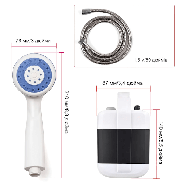 Душ простий у використанні: для ввімкнення натисніть і утримуйте кнопку протягом 3-5 секунд. Легкий і портативний, він ідеально підходить для поїздок, а довжина шланга 1,5 м забезпечує зручність користування.